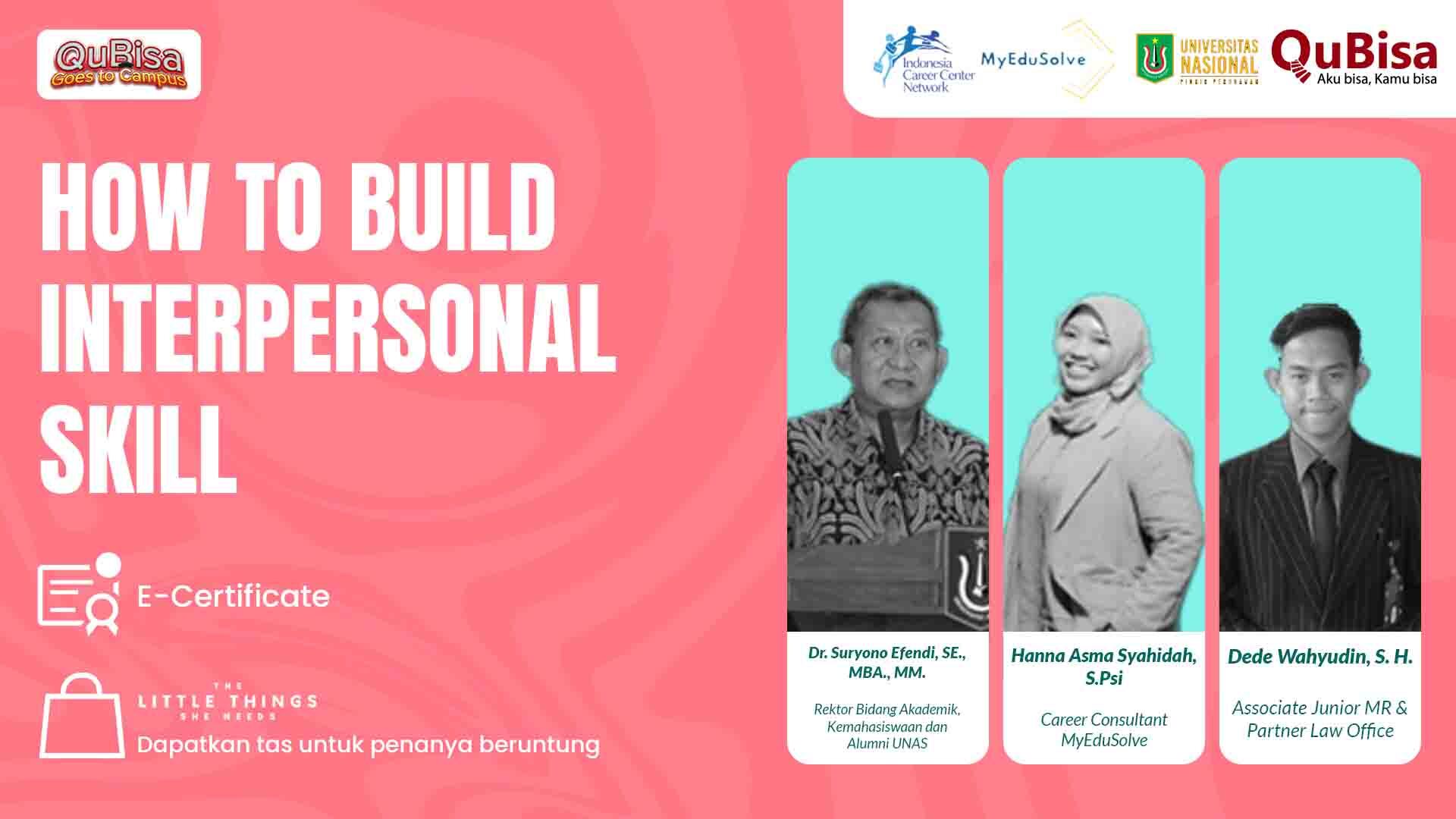 Mau karier kamu terus mengalami kemajuan? Jangan pernah abaikan pentingnya interpersonal skill! Memiliki interpersonal skill yang baik tak hanya membantu kamu dalam mengembangkan karier, bahkan juga membantu saat proses wawancara kerja. Lalu, gimana sih cara membangun interpersonal skill yang baik dan kuat? Simak di webinar ini yuk!